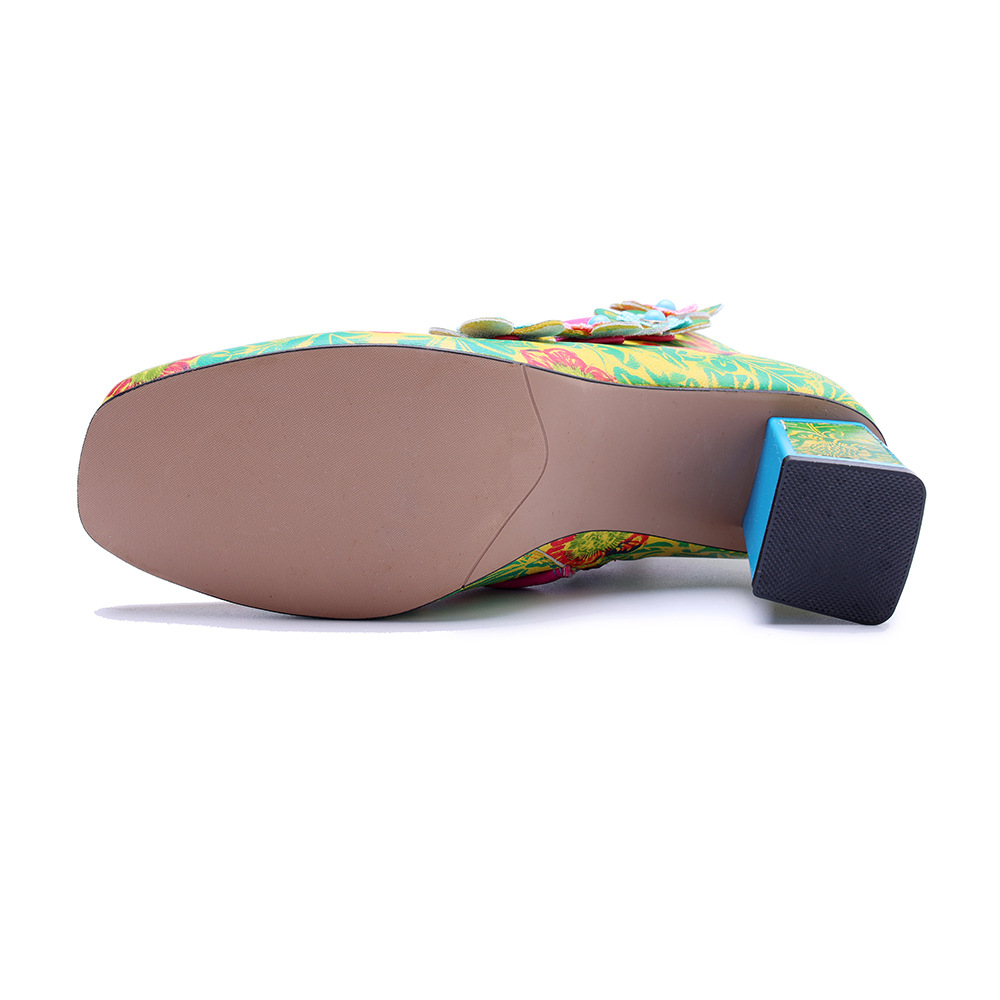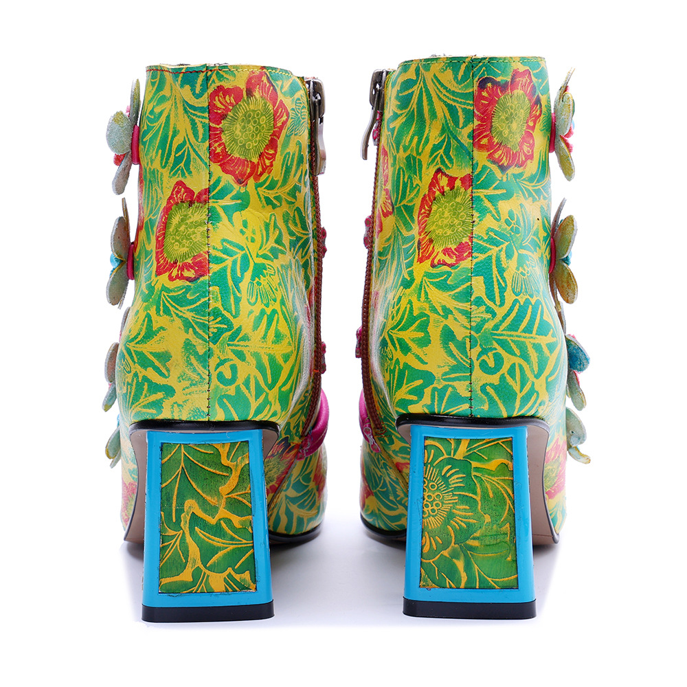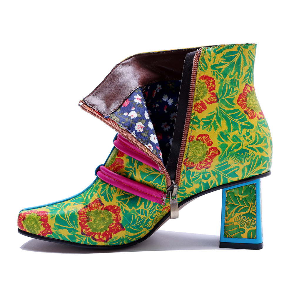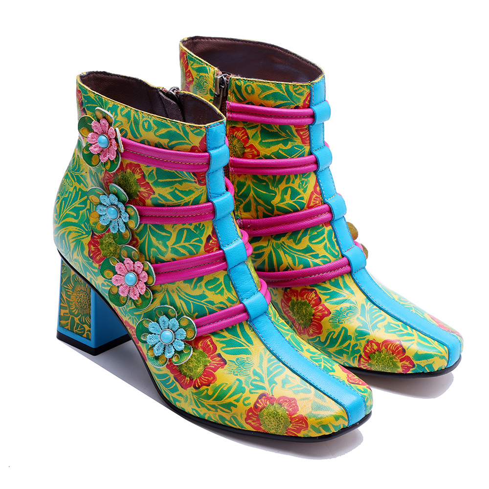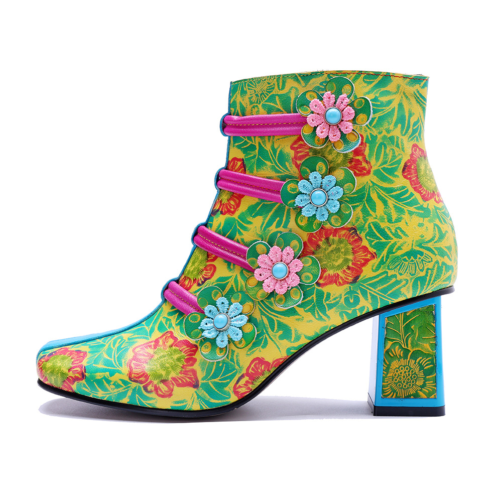 Socofy Handmade Leather Retro Floral Chunky Heel Boots