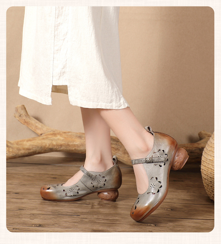 Chic Round Toe and Cutout Design Retro Soft Leather Mid Heel Shoes