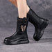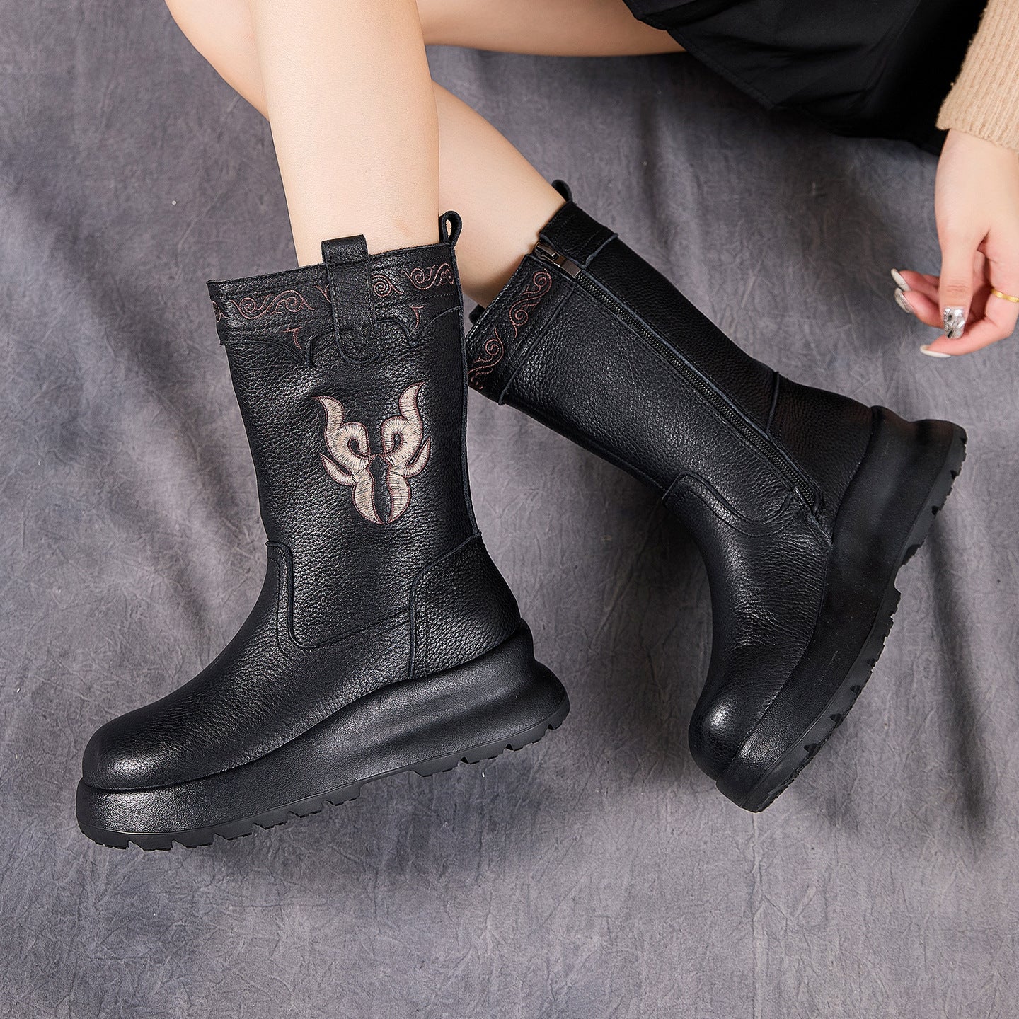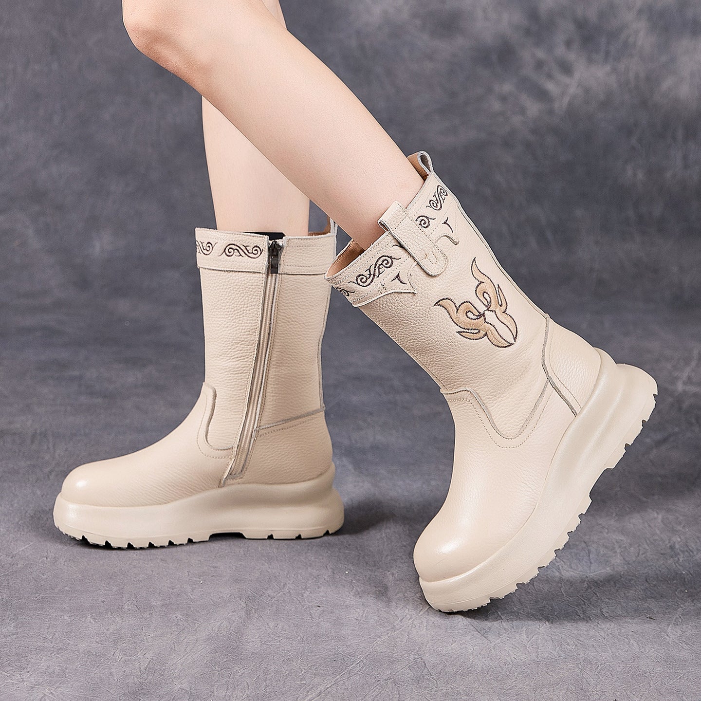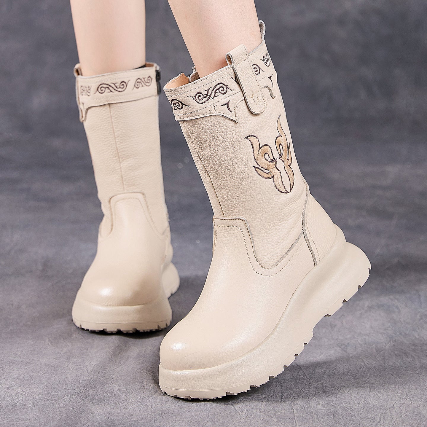 Socofy Top Grain Leather Retro Floral Embroidery Boots