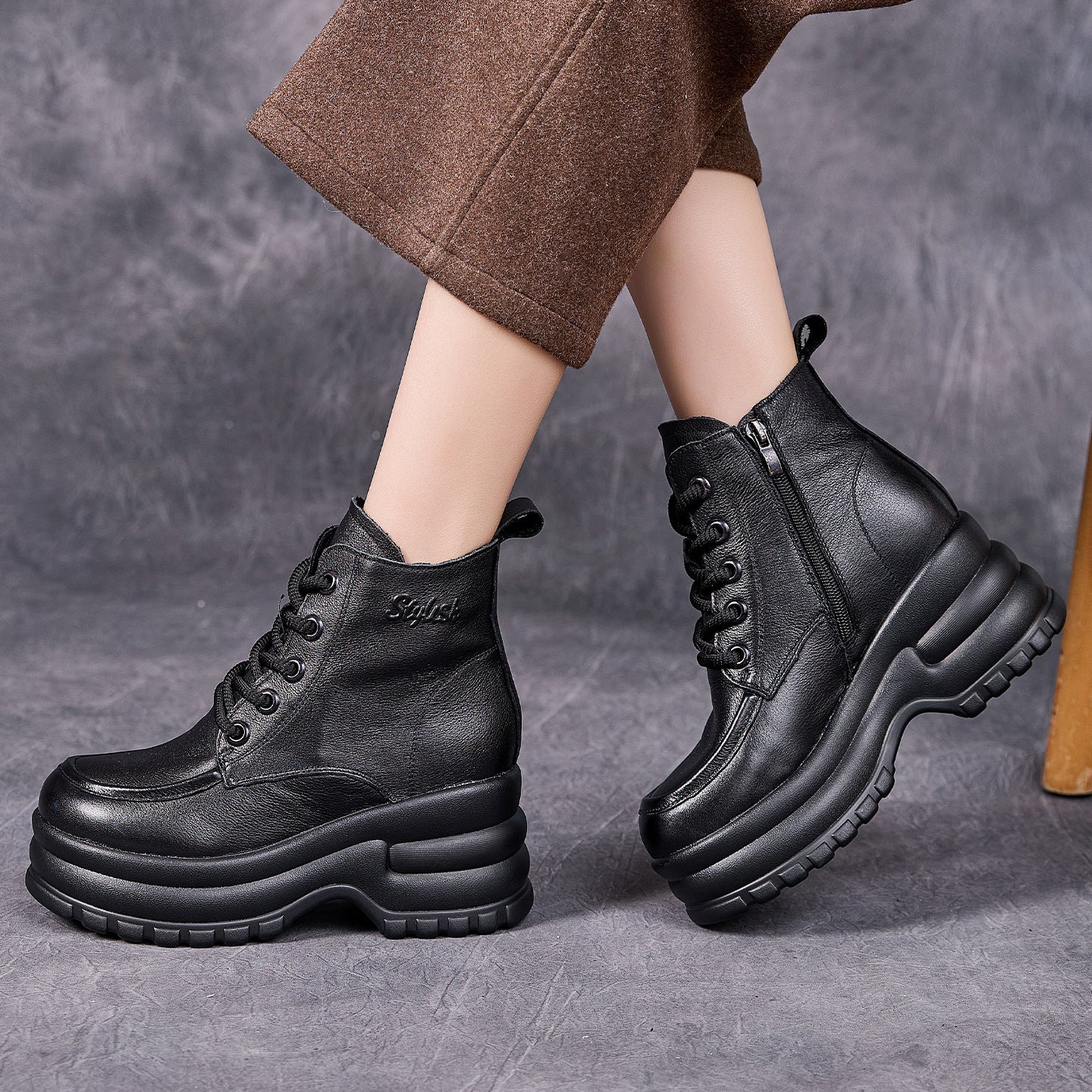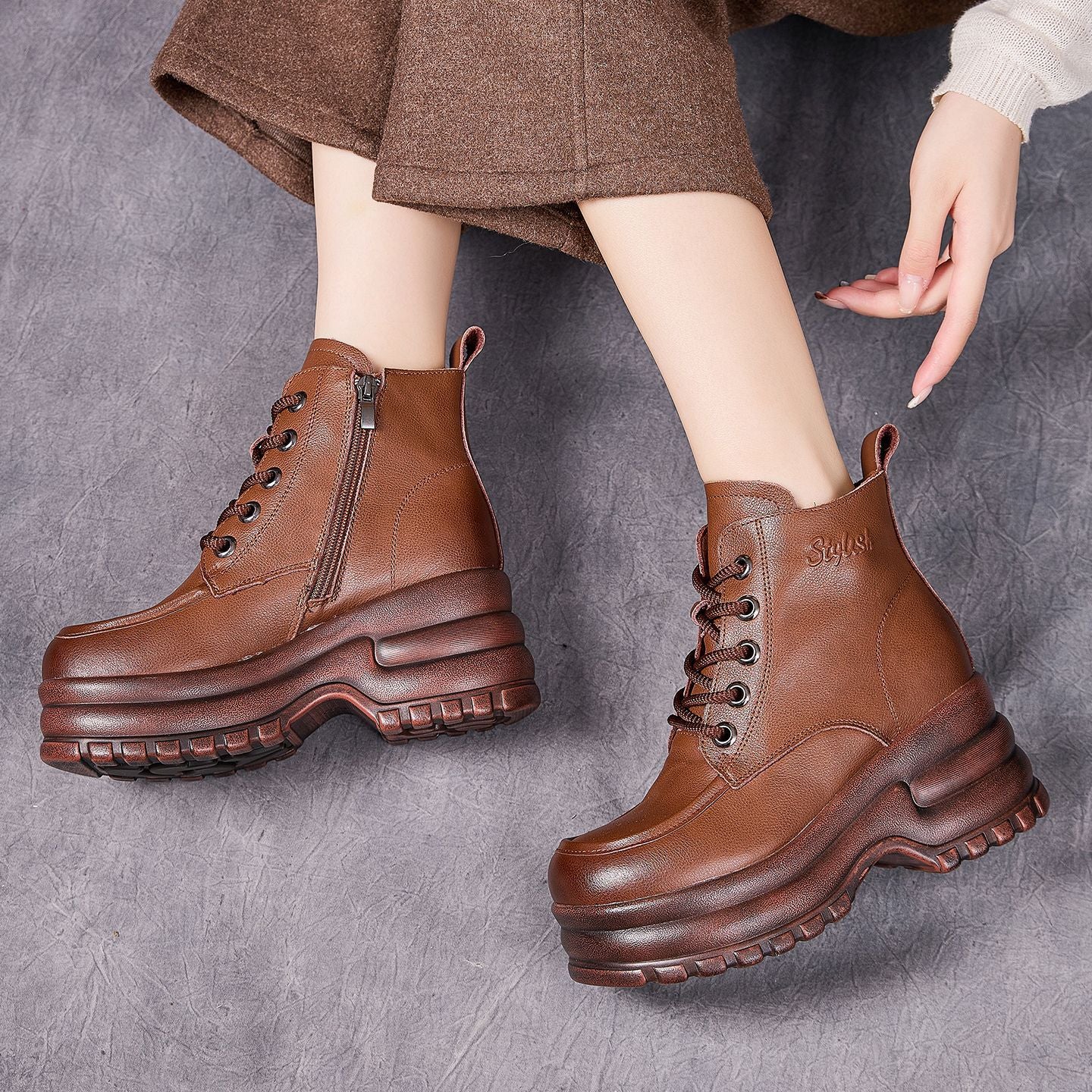 Socofy Top Grain Leather Retro Platform Short Boots