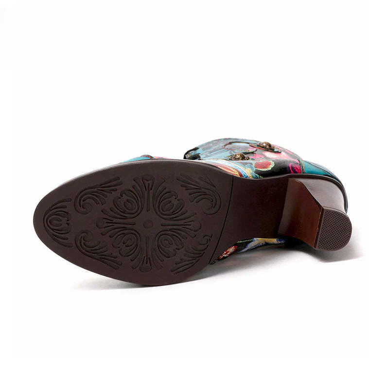 Socofy Vicconfy Ethnic Cowhide Handmade Vintage Flower High Heel Women's Boots