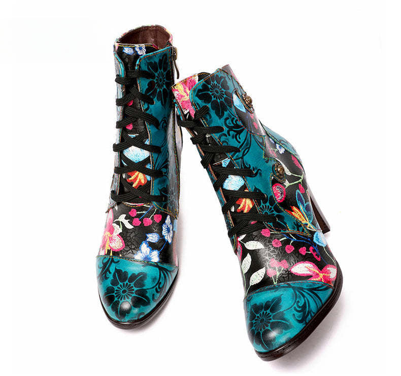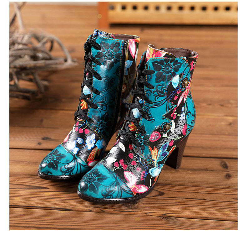 Socofy Vicconfy Ethnic Cowhide Handmade Vintage Flower High Heel Women's Boots 790