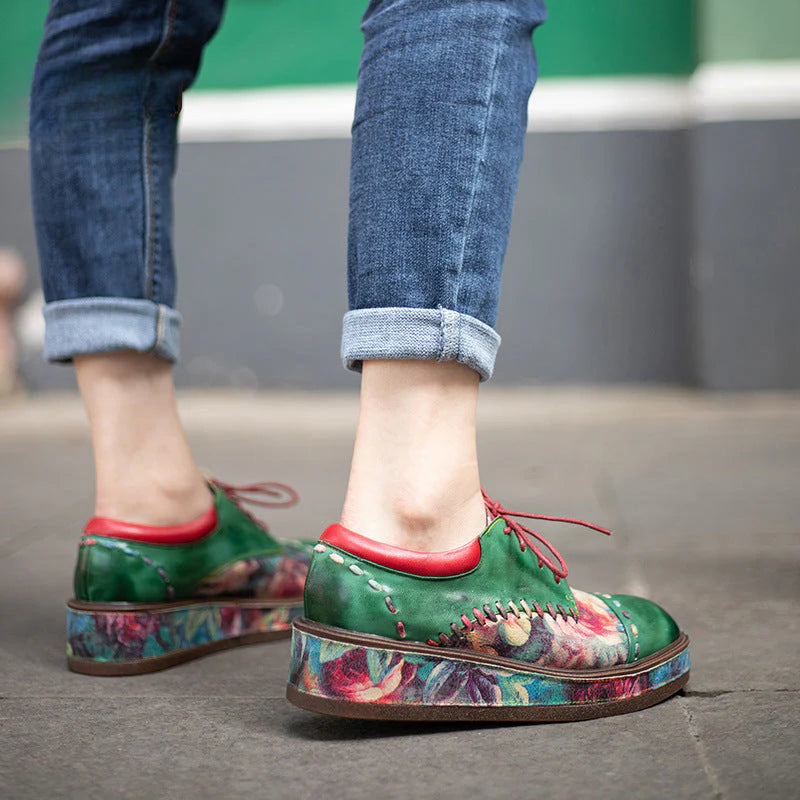 Socofy Vicconfy Retro Muffin Heel Comfortable Printed Round Toe Leather Women's Shoes Loafers