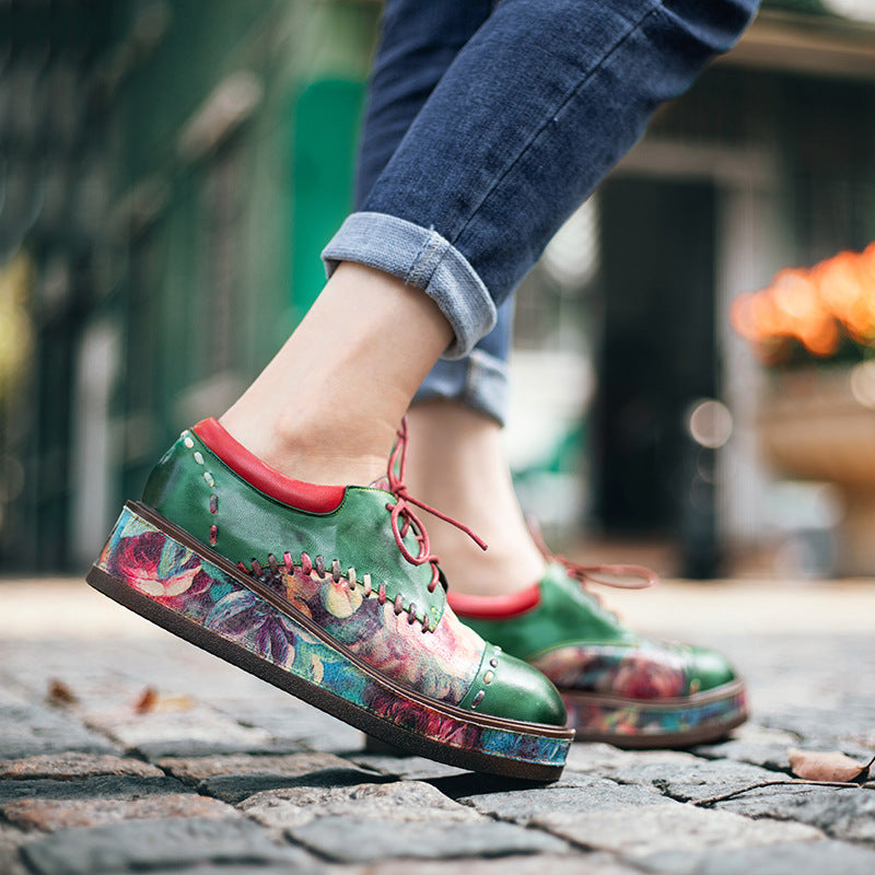 Socofy Vicconfy Retro Muffin Heel Comfortable Printed Round Toe Leather Women's Shoes Loafers 1000