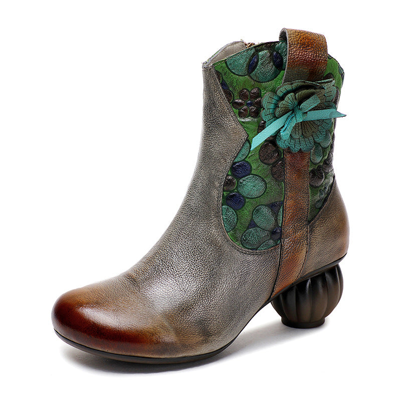 Socofy Handcrafted Leather Retro National Style Floral Mid Calf Boots