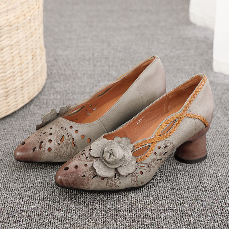 Socofy Handmade Leather Pointed Toe Chunky Heel Floral Cutout Sandals