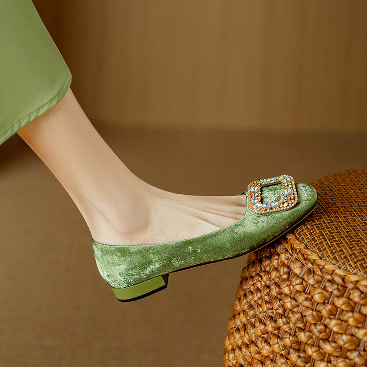 Socofy Leather Rhinestone Square Toe Chunky Heel Flats