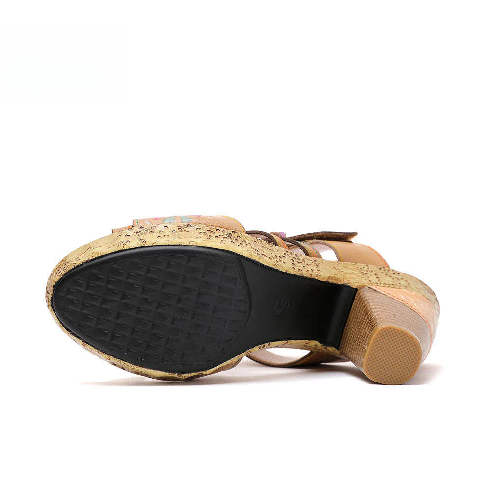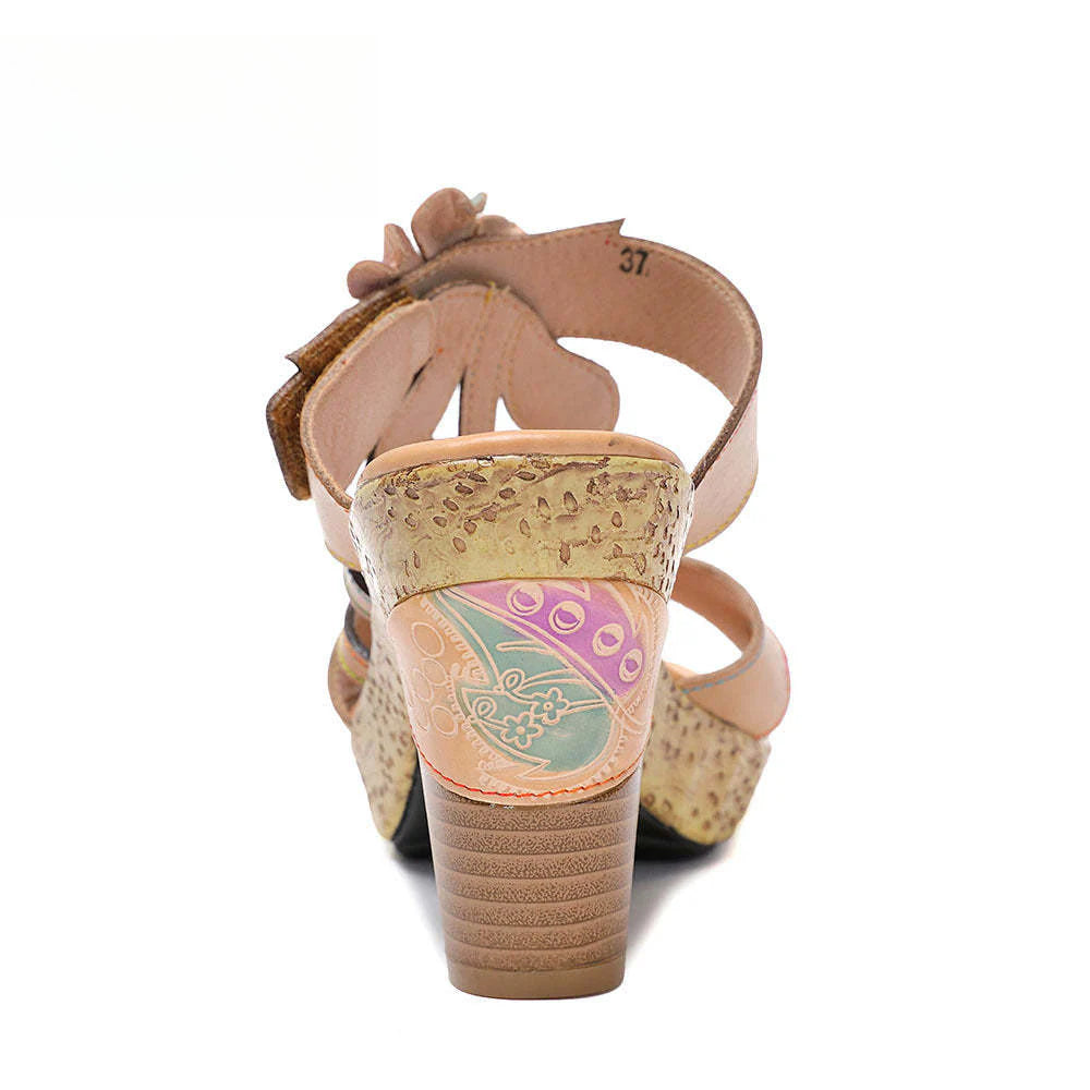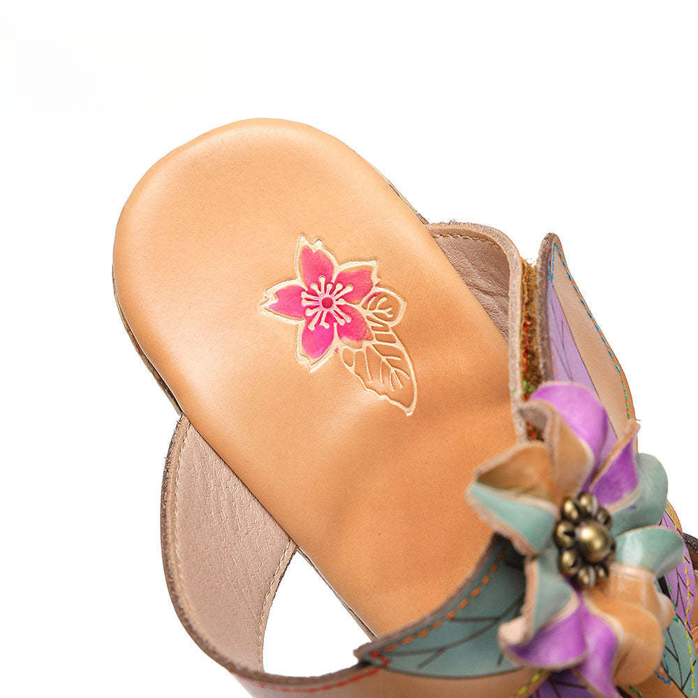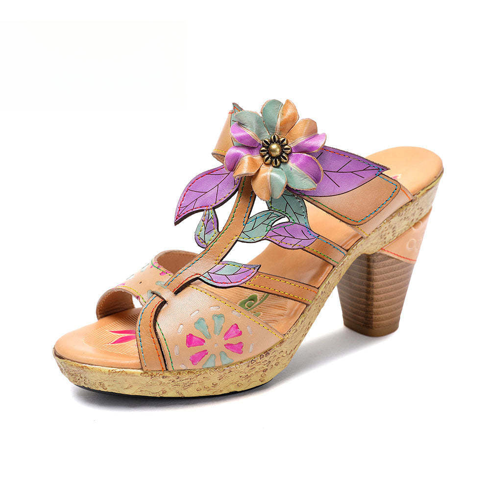 Socofy Vicconfy Flower Patchwork Head Cowhide High Heel Women's Sandals Slippers